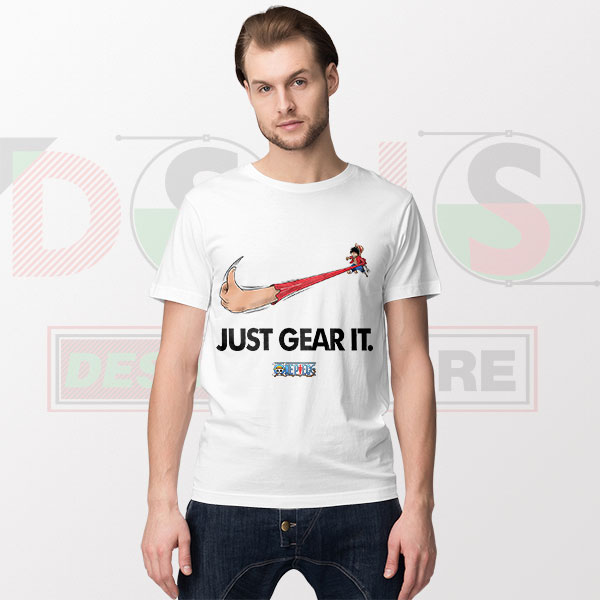 The design features Luffy stretching his iconic fist—a tribute to his Gomu Gomu no Mi abilities—to create a clever parody of the Nike swoosh. Paired with the phrase “Just Gear It”, this graphic tee delivers humor, nostalgia, and motivation all in one.