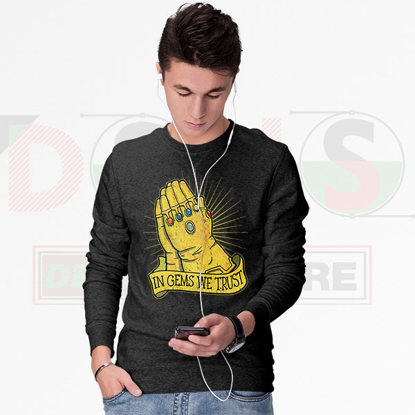 Thanos sweatshirt, In Gems We Trust Marvel, Avengers villain apparel, Infinity Gauntlet hoodie alternative, unisex graphic pullover, Marvel crewneck sweatshirt, pop culture clothing, funny superhero gift, Thanos quote shirt, comic book fan merchandise, premium sweatshirt S-3XL, DESAINS STORE exclusive, soft cotton blend sweatshirt, movie meme apparel, villain collection, streetwear Marvel.